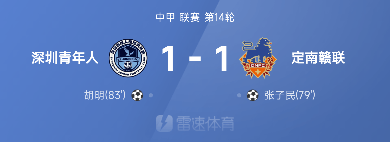 米兰体育讯:6月28日,中甲联赛第14轮,深圳青年人与定南赣联的比赛以1-1平局收场,胡明在第83分钟进球救助球队。比赛期间,张子民和胡明各自为两队贡献了精彩入球。