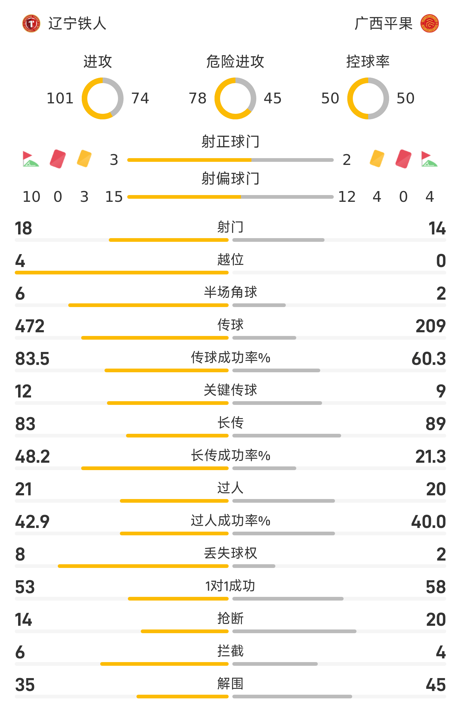 辽宁铁人首发阵容:20-刘伟国、3-潘喜明、5-栗鹏、4-刘浪舟(84’19-高海生)、2-孙康博、10-邦本宜裕、18-田依浓(64’36-田德澳)、14-臧一锋、15-费利佩、8-安以恩(80’11-桂子涵)、9-姆本扎